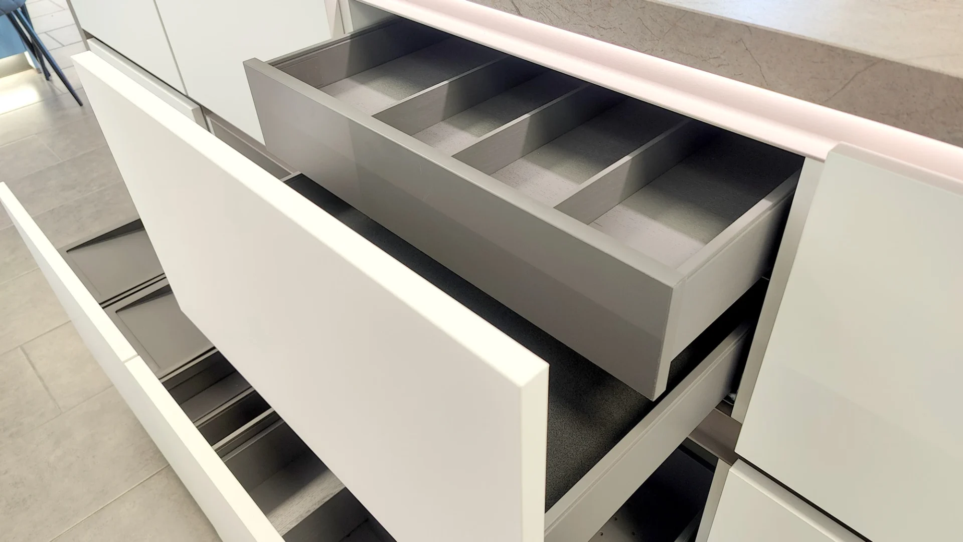 • Matte white lacquered front and Macchiatto door.