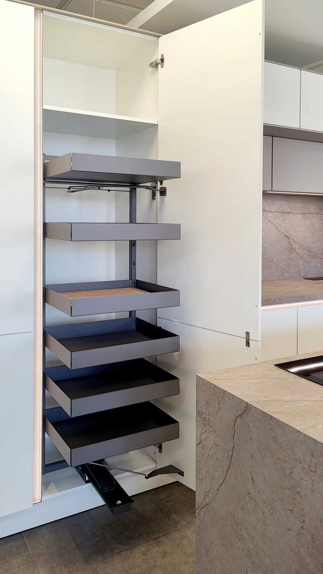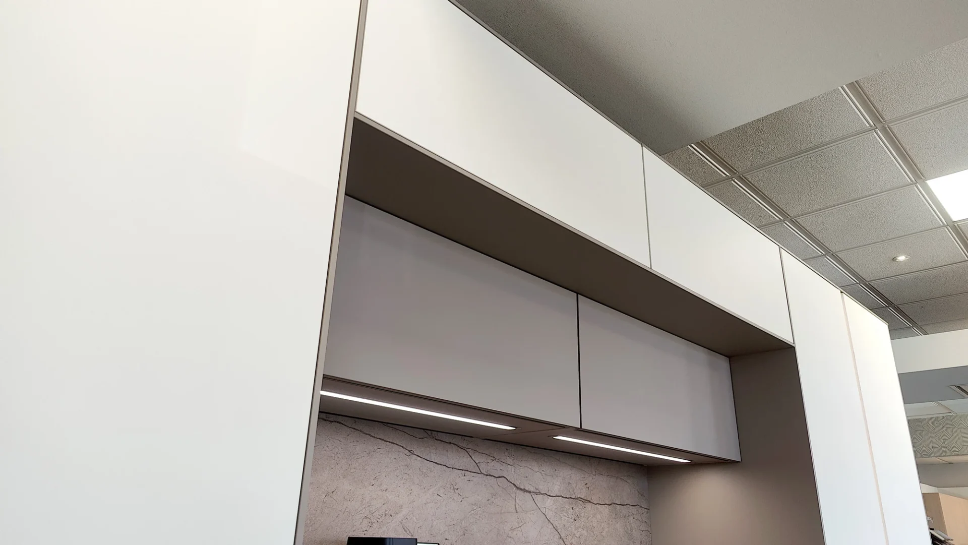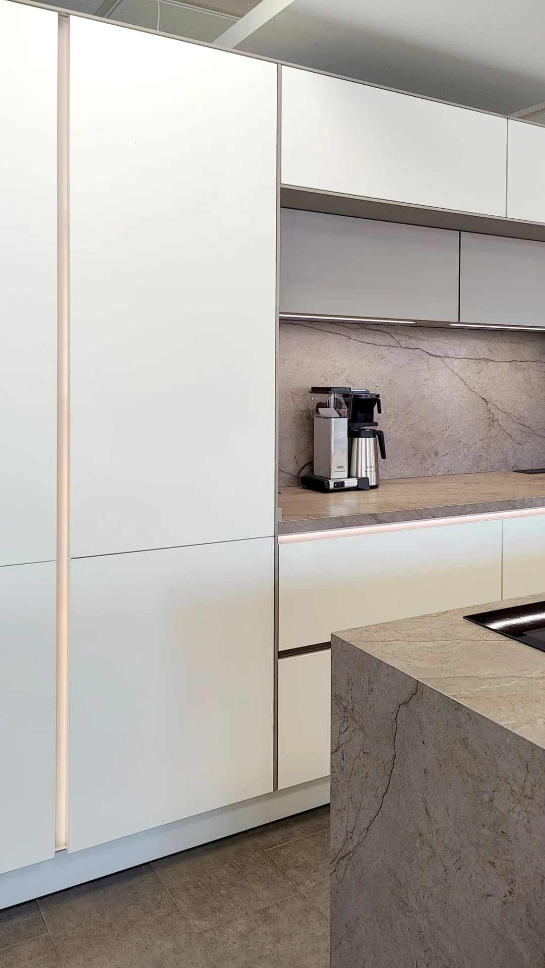 A sleek and elegant kitchen with a white lacquered Macchiatto-style front and high-end finishes is now available in our La Cala de Mijasshowroom. A blend of light and gray tones with silver accents and spotlights makes the Macchiatto model a stylish, inviting, and sophisticated kitchen. It is complemented by a matte Ascale Nebula Brown countertop.
